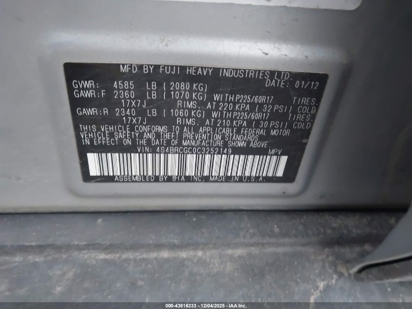 2012 SUBARU OUTBACK 2.5I PREMIUM
