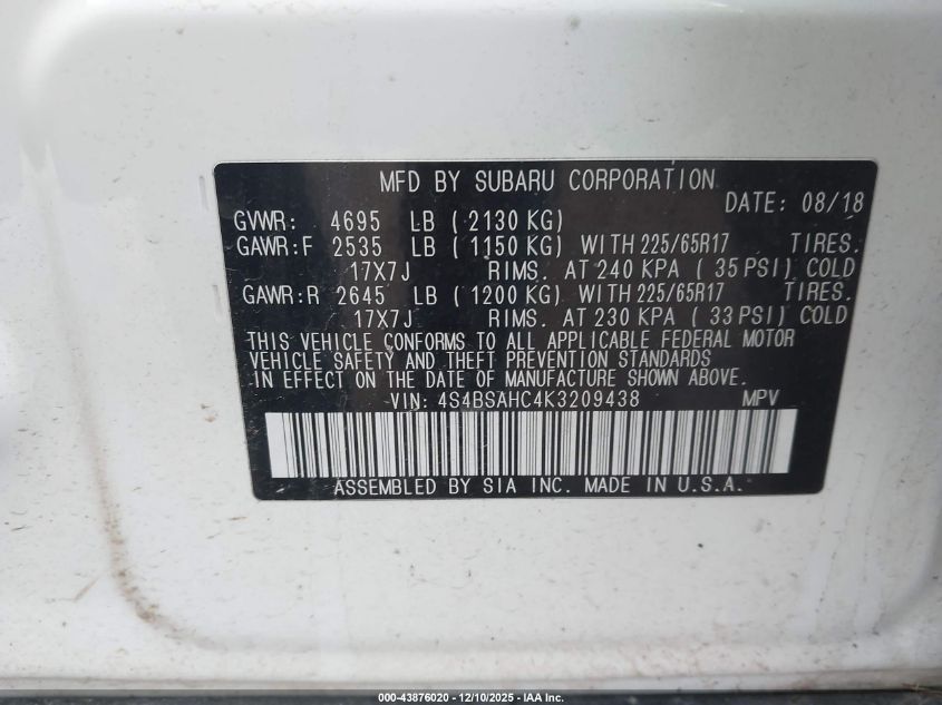 2019 SUBARU OUTBACK 2.5I PREMIUM