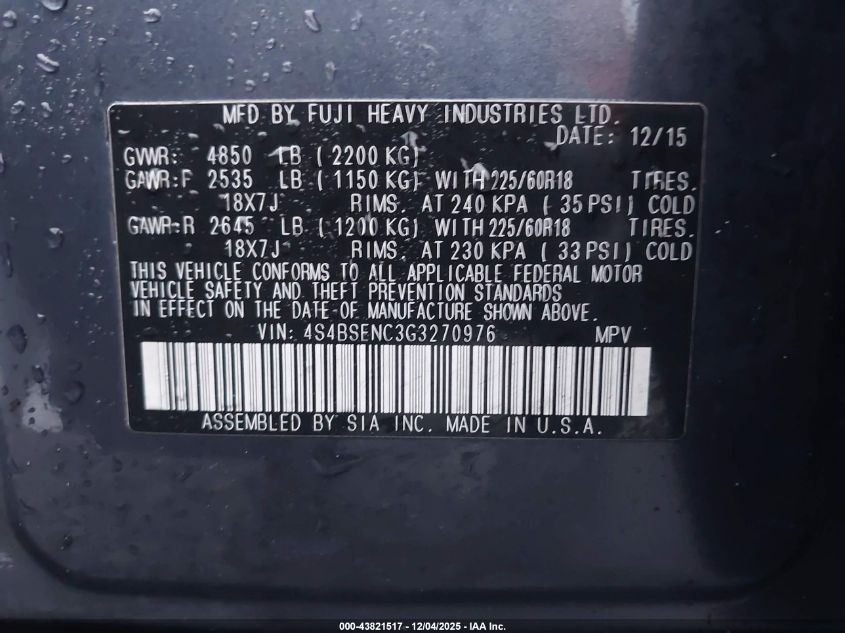2016 SUBARU OUTBACK 2016 року Бензин, 3.6, Полный привод, vin - 4S4BSENC3G3270976 из США