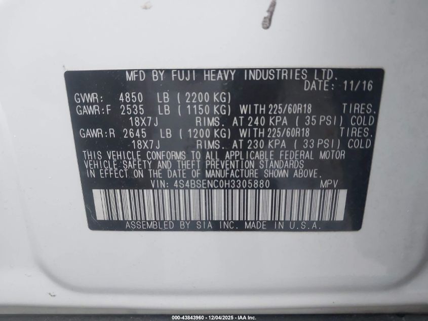 2017 SUBARU OUTBACK 2017 року Бензин, 3.6, Полный привод, vin - 4S4BSENC0H3305880 из США