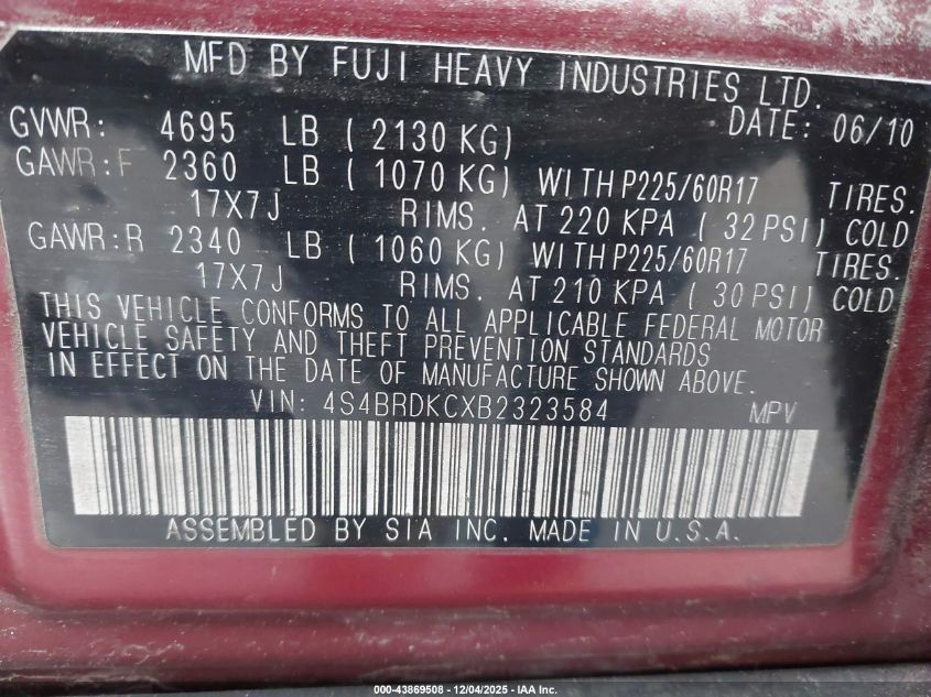 2011 SUBARU OUTBACK 2.5I LIMITED