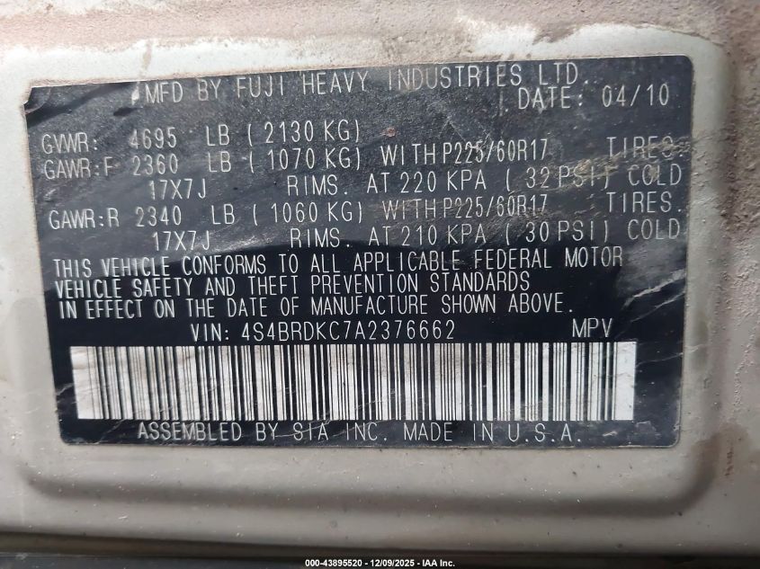 2010 SUBARU OUTBACK 3.6R LIMITED