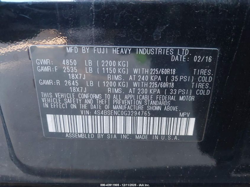 2016 SUBARU OUTBACK 2.5I LIMITED