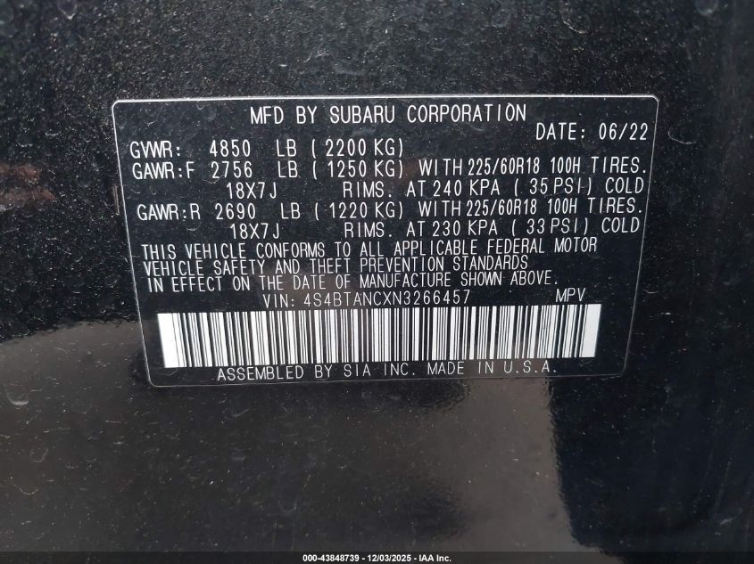 2022 SUBARU OUTBACK 2022 року Бензин, 2.5, Полный привод, vin - 4S4BTANCXN3266457 из США