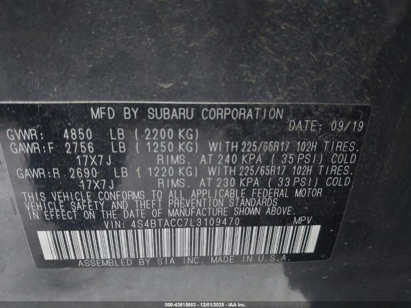 2020 SUBARU OUTBACK 2020 року Бензин, 2.5, Полный привод, vin - 4S4BTACC7L3109470 из США