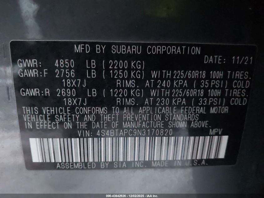 2022 SUBARU OUTBACK 2022 року Бензин, 2.5, Полный привод, vin - 4S4BTAPC9N3170820 из США