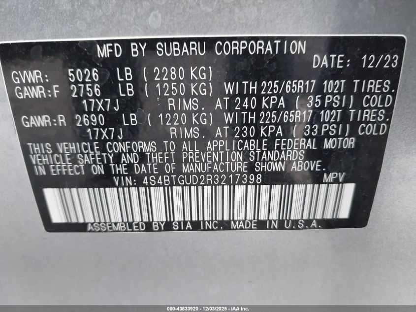 Цвет СеребряныйЦилиндры 4Привод Полный приводVIN 4S4BTGUD2R3217398Состояние СтационарноПовреждения Передняя правая AutoRIA