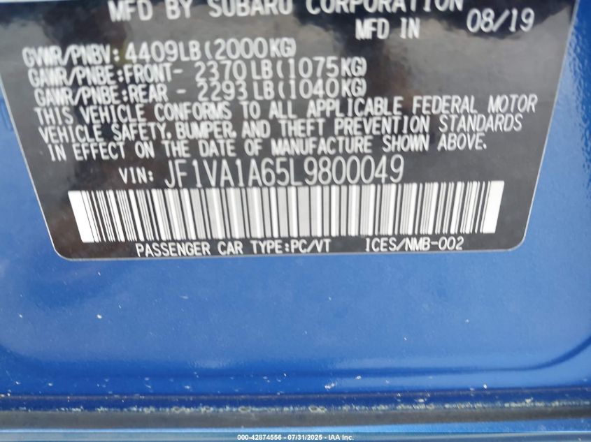 2020 SUBARU WRX 2020 року Бензин, 2.0, Полный привод, vin - JF1VA1A65L9800049 из США