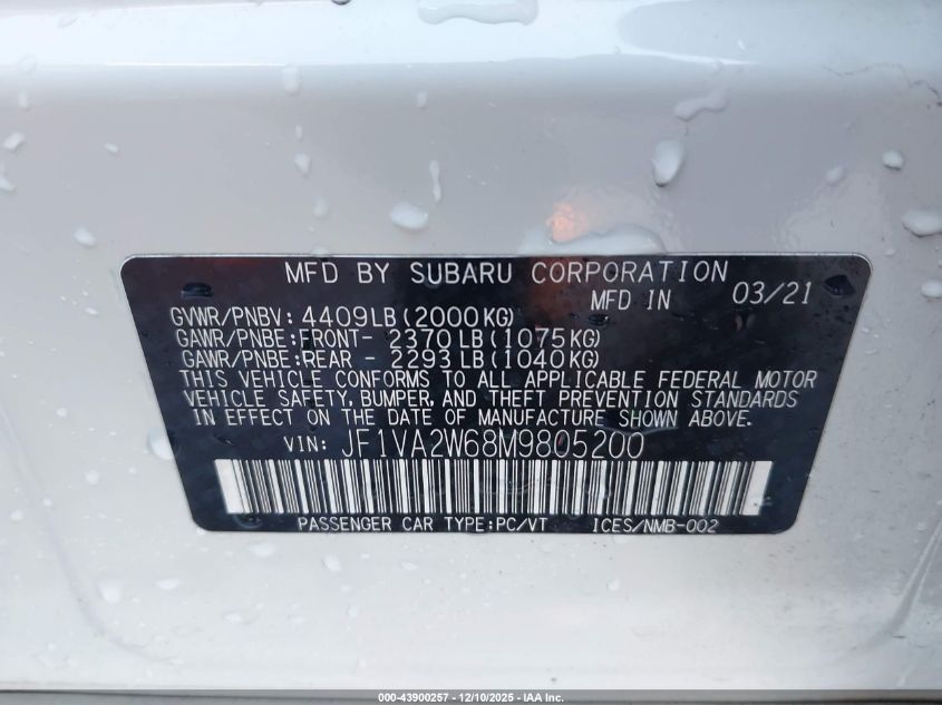 2021 SUBARU WRX 2021 року Бензин, 2.5, Полный привод, vin - JF1VA2W68M9805200 из США