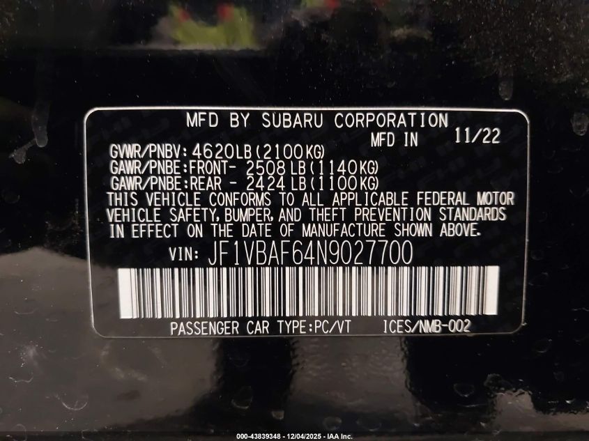 2022 SUBARU WRX 2022 року Бензин, 2.4, Полный привод, vin - JF1VBAF64N9027700 из США