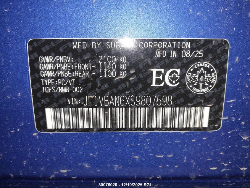 2025 SUBARU WRX 2025 року Бензин, , Полный привод, vin - JF1VBAN6XS9807598 из США