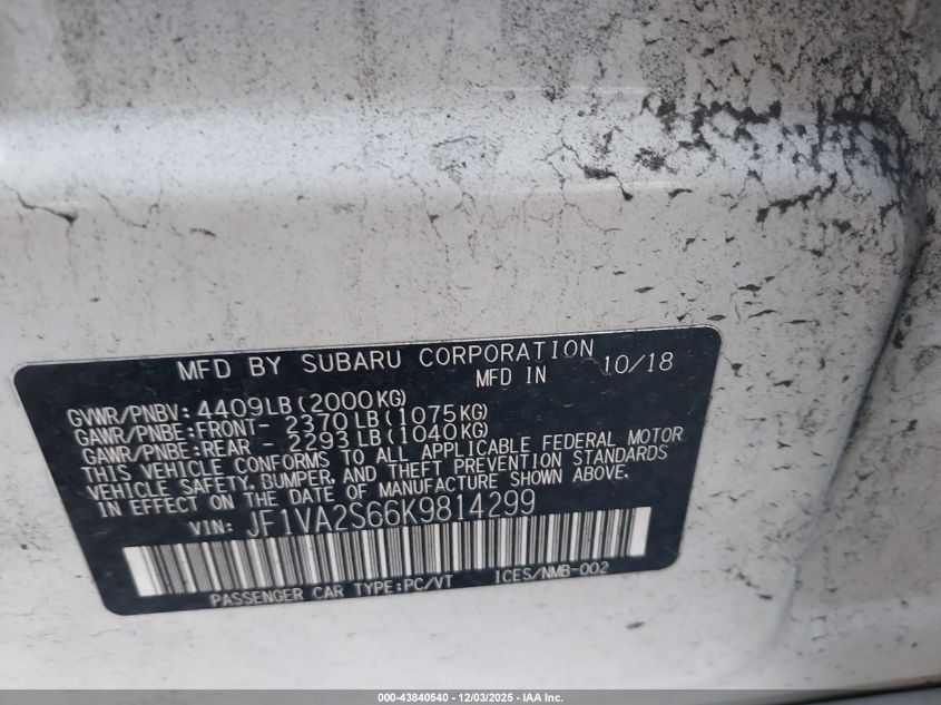 2019 SUBARU WRX 2019 року Бензин, 2.5, Полный привод, vin - JF1VA2S66K9814299 из США