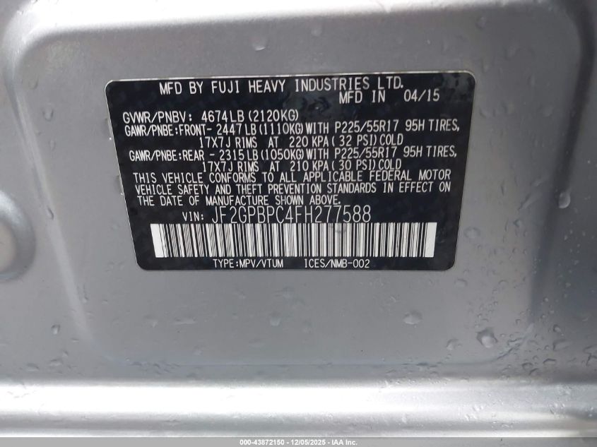 Цвет СеребряныйЦилиндры 4Привод Полный приводVIN JF2GPBPC4FH277588Состояние Заводится и едет (проверено)Повреждения Передняя правая AutoRIA