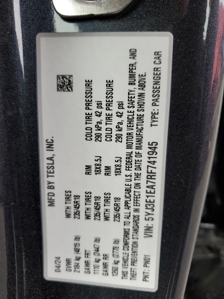 2024 TESLA MODEL 3 2024 року Электрический, , Задний привод, vin - 5YJ3E1EA7RF741945 из США