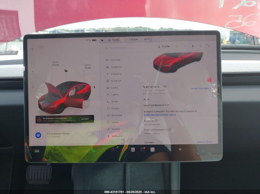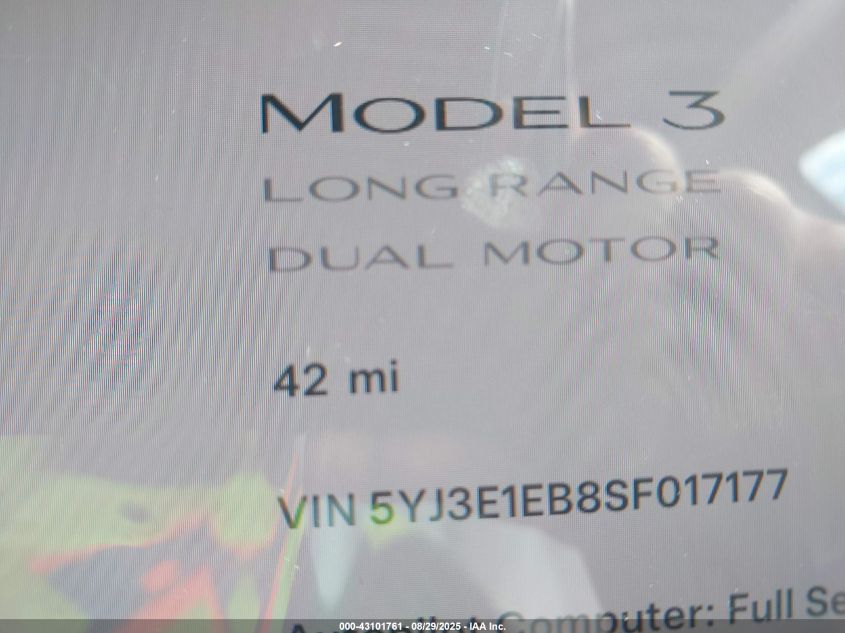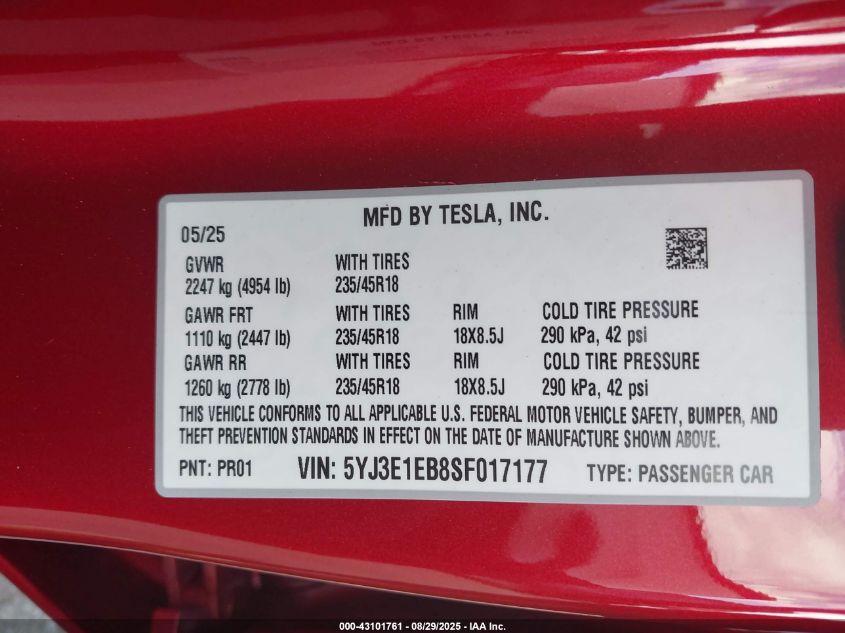 2025 TESLA MODEL 3 2025 року Электрический, U, Полный привод, vin - 5YJ3E1EB8SF017177 из США