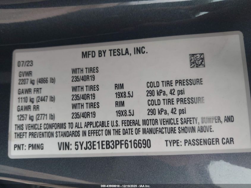 2023 TESLA MODEL 3 2023 року Электрический, U, Полный привод, vin - 5YJ3E1EB3PF616690 из США