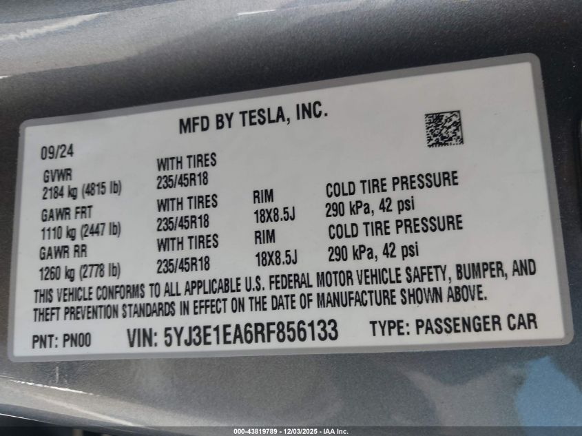 2024 TESLA MODEL 3 2024 року Электрический, U, Задний привод, vin - 5YJ3E1EA6RF856133 из США