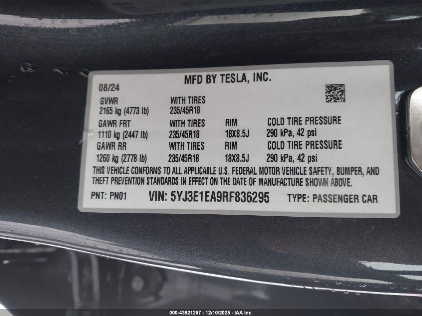 2024 TESLA MODEL 3 2024 року Электрический, U, Задний привод, vin - 5YJ3E1EA9RF836295 из США