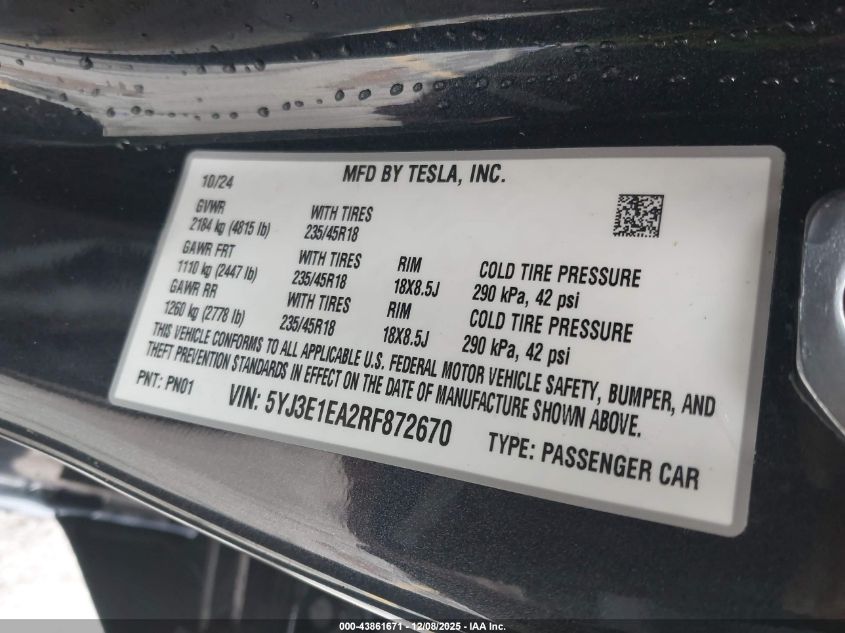 2024 TESLA MODEL 3 2024 року Электрический, U, Задний привод, vin - 5YJ3E1EA2RF872670 из США
