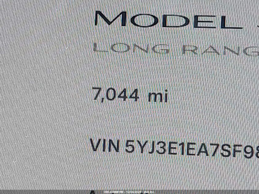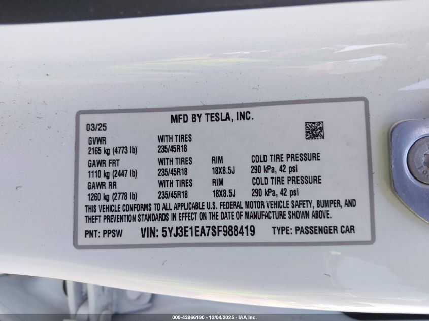 2025 TESLA MODEL 3 2025 року Электрический, U, Задний привод, vin - 5YJ3E1EA7SF988419 из США