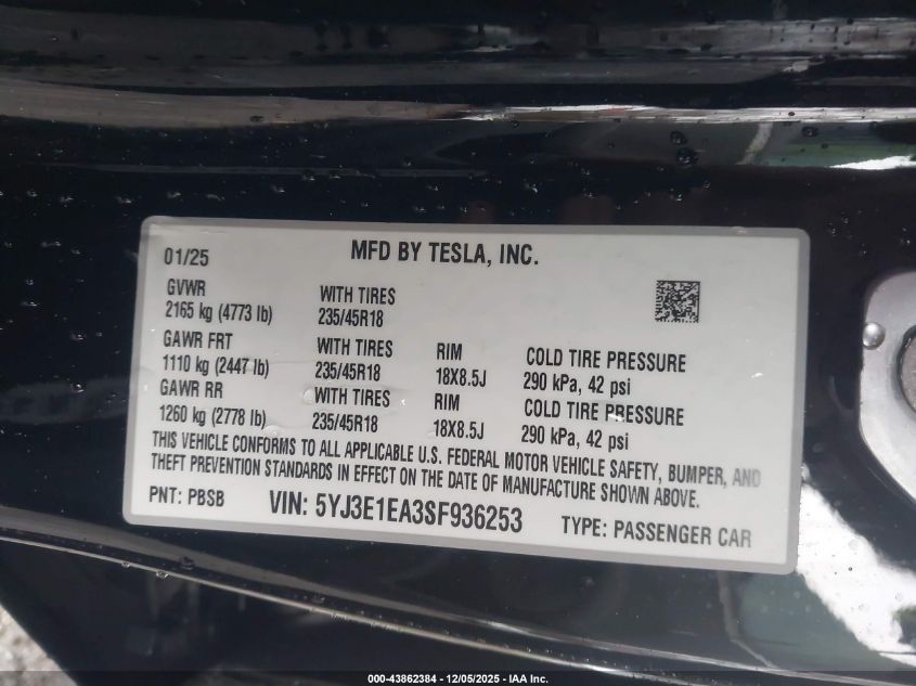 2025 TESLA MODEL 3 2025 року Электрический, U, Задний привод, vin - 5YJ3E1EA3SF936253 из США