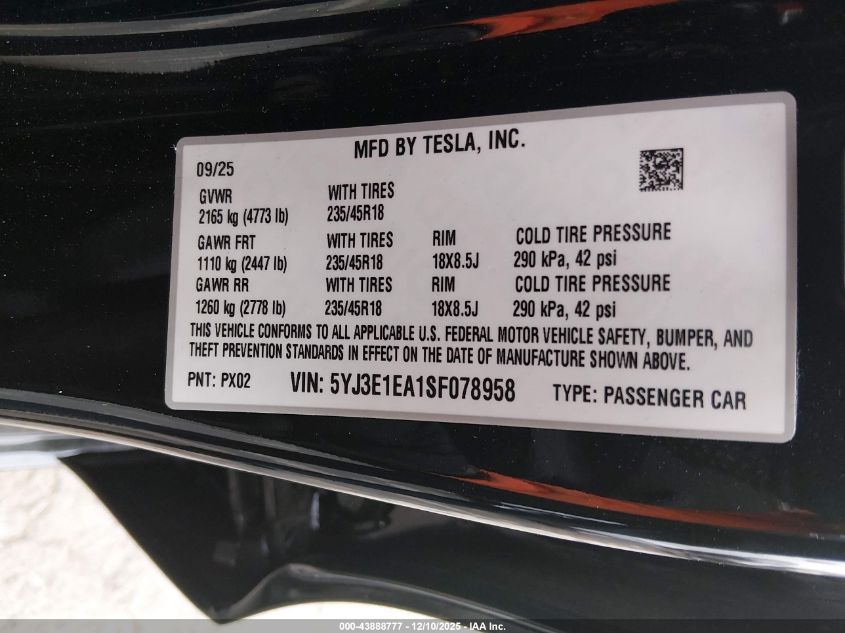 2025 TESLA MODEL 3 2025 року Электрический, U, Задний привод, vin - 5YJ3E1EA1SF078958 из США