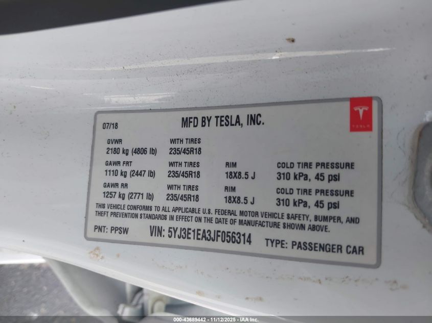 2018 TESLA MODEL 3 2018 року Электрический, U, Задний привод, vin - 5YJ3E1EA3JF056314 из США