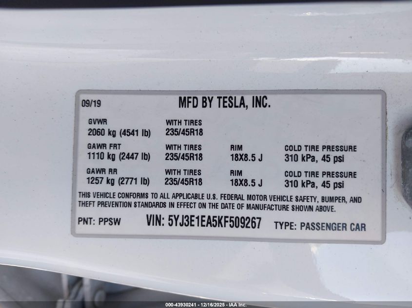 2019 TESLA MODEL 3