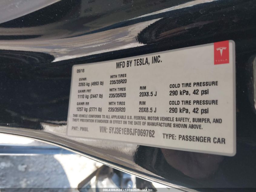 2018 TESLA MODEL 3 2018 року Электрический, U, Полный привод, vin - 5YJ3E1EB6JF069762 из США