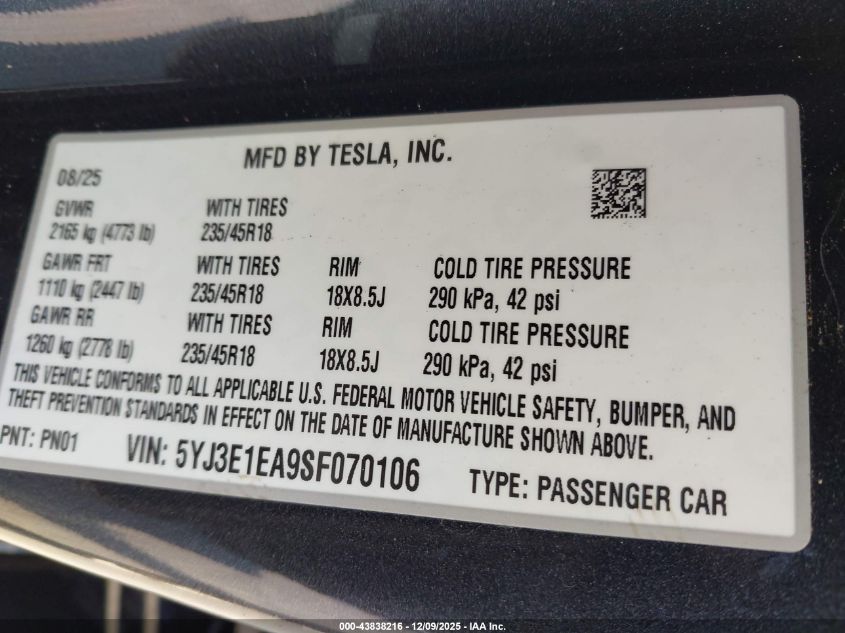 2025 TESLA MODEL 3 2025 року Электрический, U, Задний привод, vin - 5YJ3E1EA9SF070106 из США
