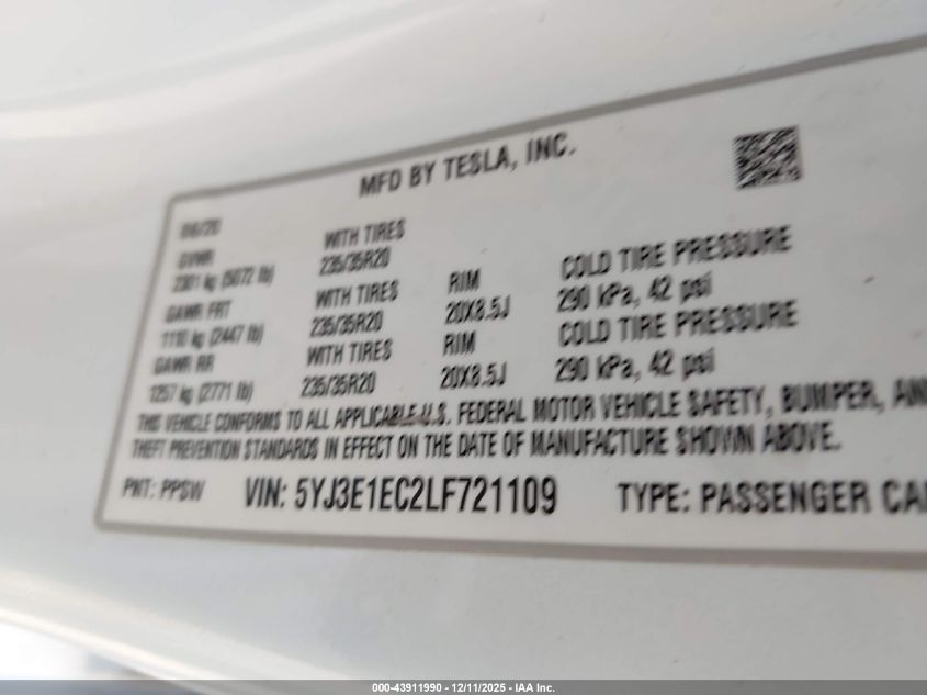 2020 TESLA MODEL 3 2020 року Электрический, U, Полный привод, vin - 5YJ3E1EC2LF721109 из США