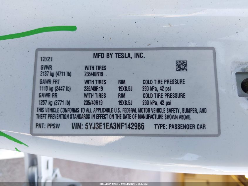 2022 TESLA MODEL 3 2022 року Электрический, U, Задний привод, vin - 5YJ3E1EA3NF142986 из США