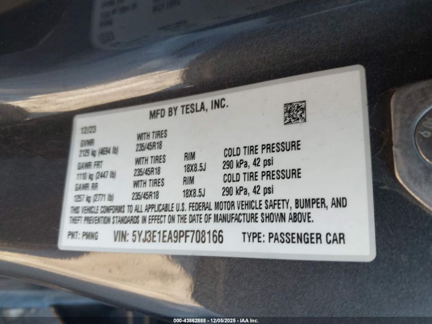 2023 TESLA MODEL 3 2023 року Электрический, U, Задний привод, vin - 5YJ3E1EA9PF708166 из США