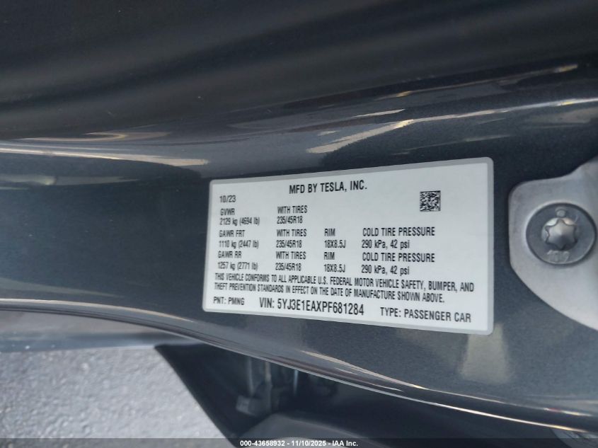 2023 TESLA MODEL 3 2023 року Электрический, U, Задний привод, vin - 5YJ3E1EAXPF681284 из США