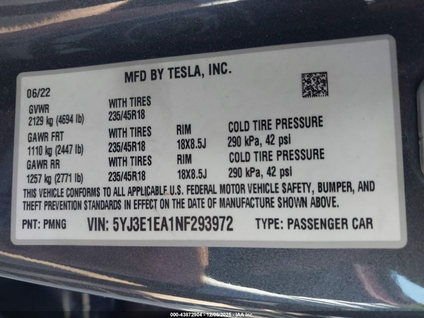 2022 TESLA MODEL 3 2022 року Электрический, U, Задний привод, vin - 5YJ3E1EA1NF293972 из США