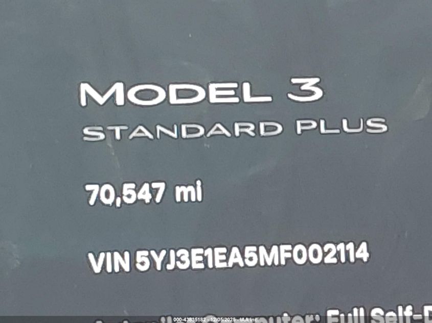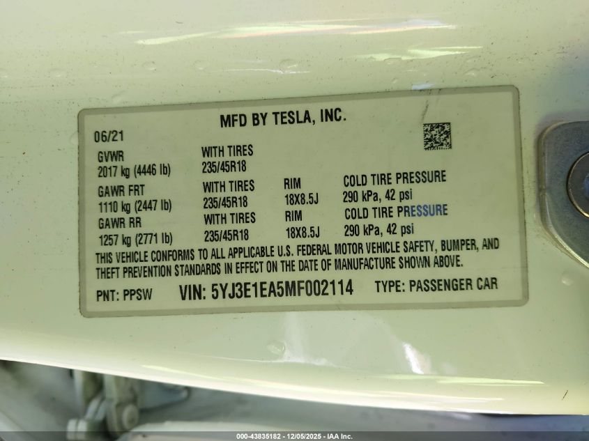 2021 TESLA MODEL 3 2021 року Электрический, U, Задний привод, vin - 5YJ3E1EA5MF002114 из США
