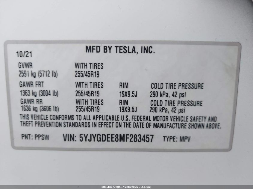 2021 TESLA MODEL Y 2021 року Электрический, U, Полный привод, vin - 5YJYGDEE8MF283457 из США