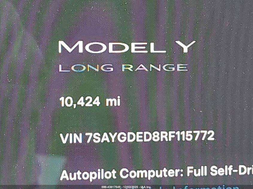 2024 TESLA MODEL Y 2024 року Электрический, U, , vin - 7SAYGDED8RF115772 из США