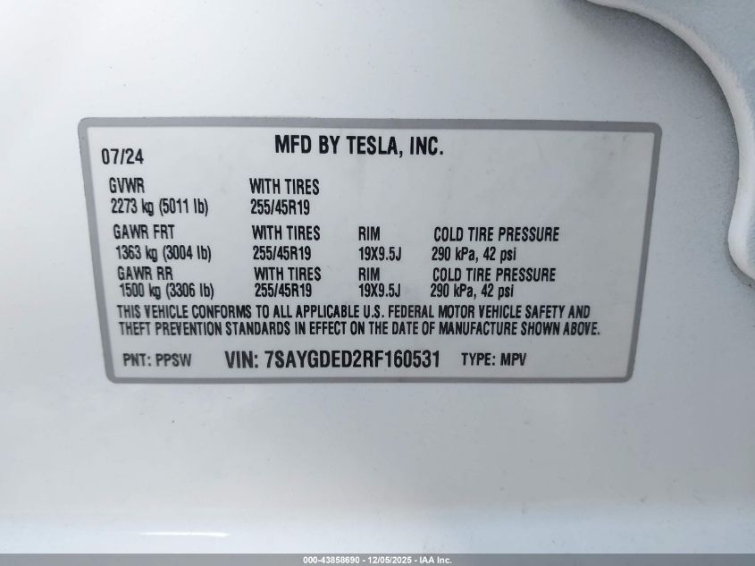 2024 TESLA MODEL Y 2024 року Электрический, U, , vin - 7SAYGDED2RF160531 из США