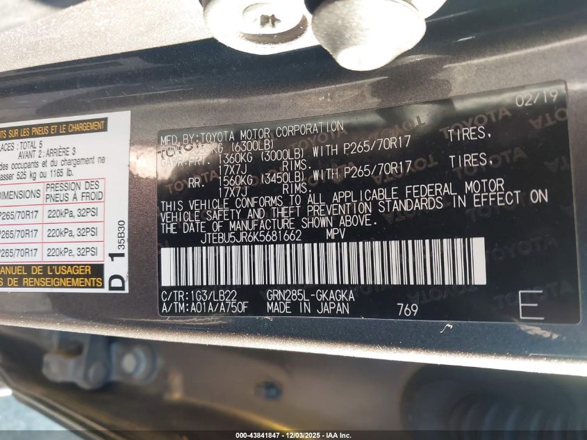 2019 TOYOTA 4RUNNER 2019 року Бензин, 4.0, Полный привод, vin - JTEBU5JR6K5681662 из США