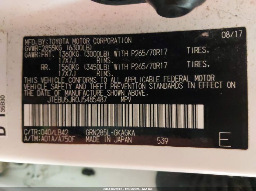 2018 TOYOTA 4RUNNER 2018 року Бензин, 4.0, Полный привод, vin - JTEBU5JR0J5485487 из США