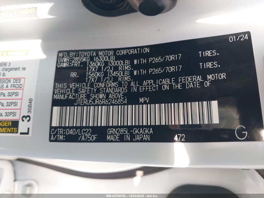 2024 TOYOTA 4RUNNER 2024 року Бензин, 4.0, Полный привод, vin - JTERU5JR6R6246854 из США