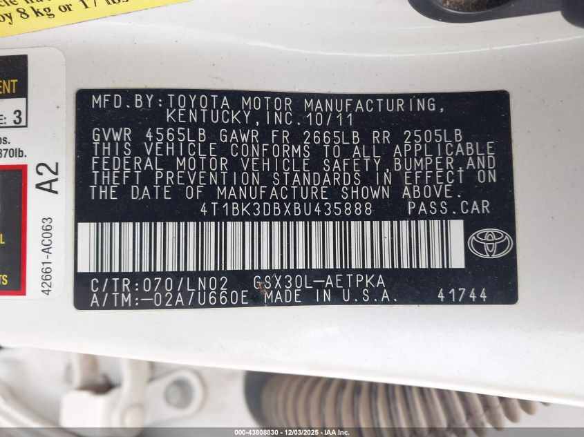 Цвет БелыйЦилиндры 6Привод Передний приводVIN 4T1BK3DBXBU435888Состояние Заводится и едет (проверено)Повреждения Передняя или задняя AutoRIA