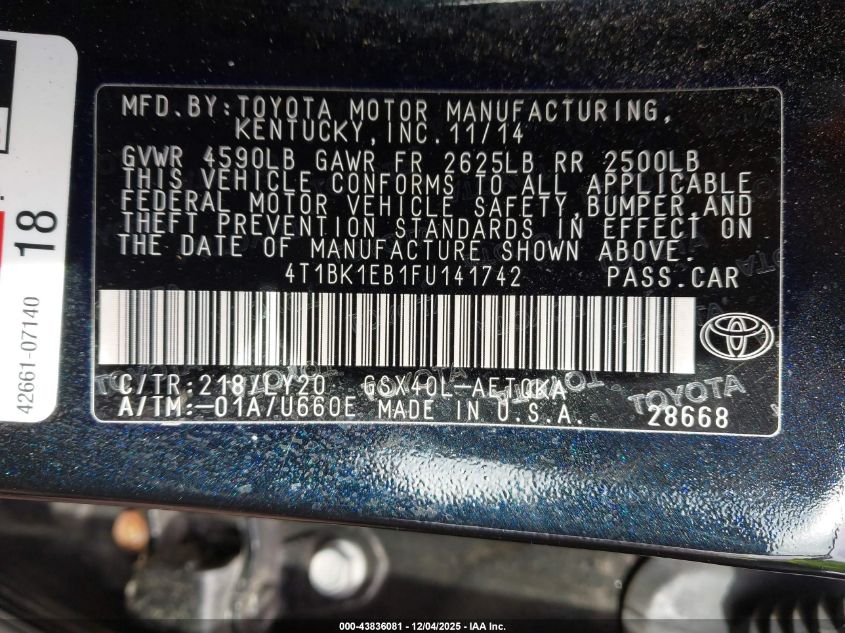 2015 TOYOTA AVALON 2015 року Бензин, 3.5, Передний привод, vin - 4T1BK1EB1FU141742 из США