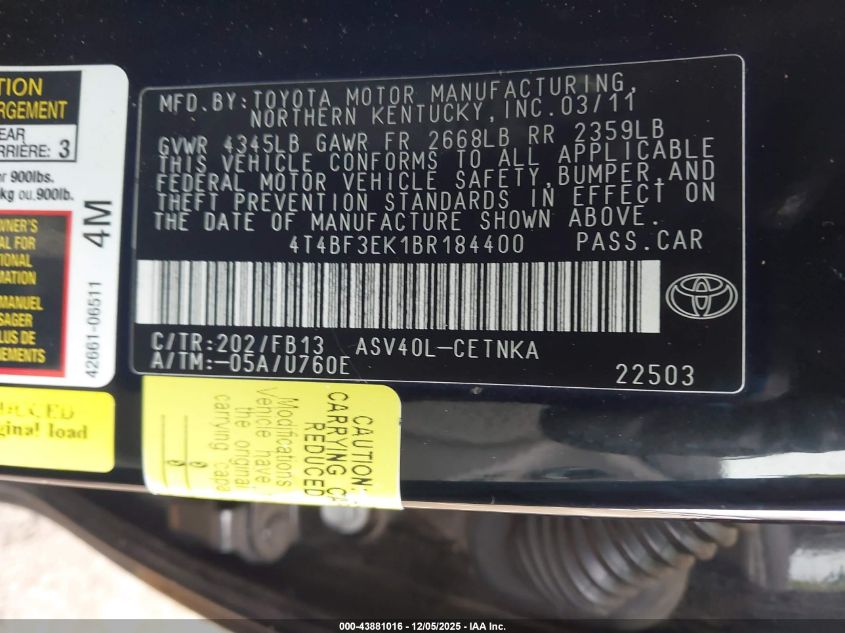 Цвет ЧерныйЦилиндры 4Привод Передний приводVIN 4T4BF3EK1BR184400Состояние Заводится и едет (проверено)Повреждения Передняя или задняя AutoRIA