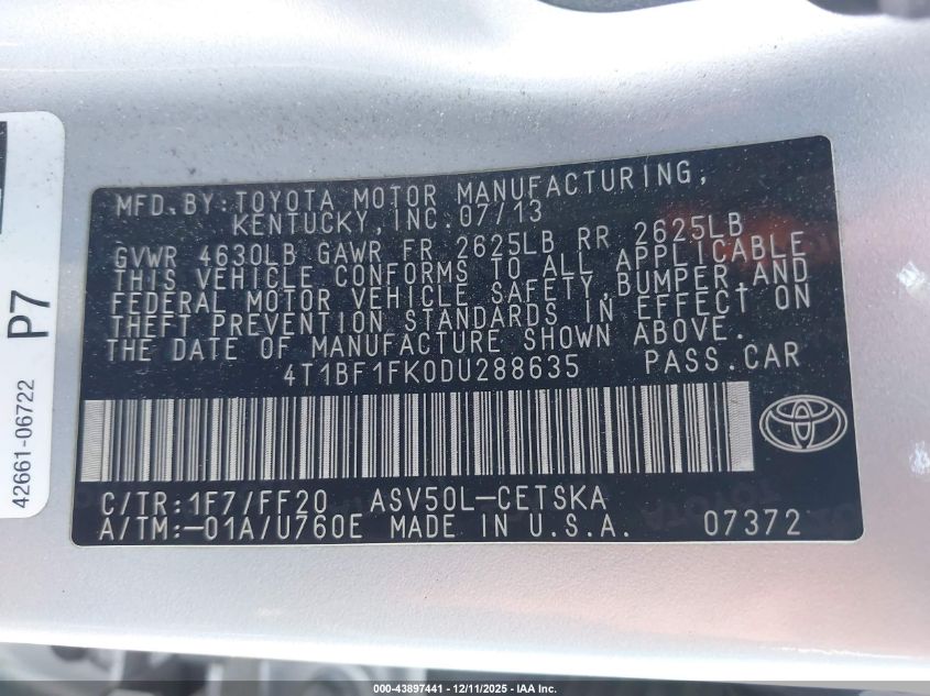 2013 TOYOTA CAMRY 2013 року Бензин, 2.5, Передний привод, vin - 4T1BF1FK0DU288635 из США