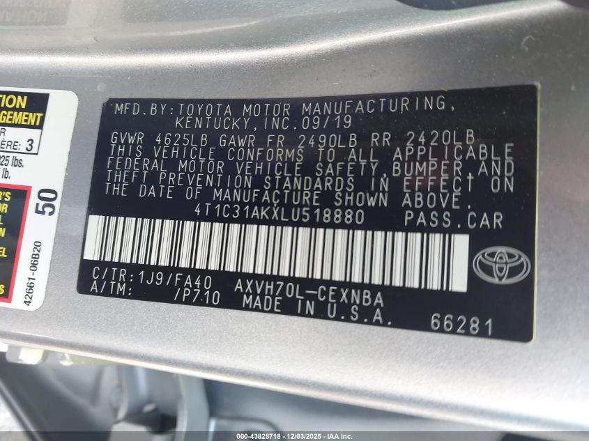 2020 TOYOTA CAMRY HYBRID 2020 року Гибрид, 2.5, Передний привод, vin - 4T1C31AKXLU518880 из США