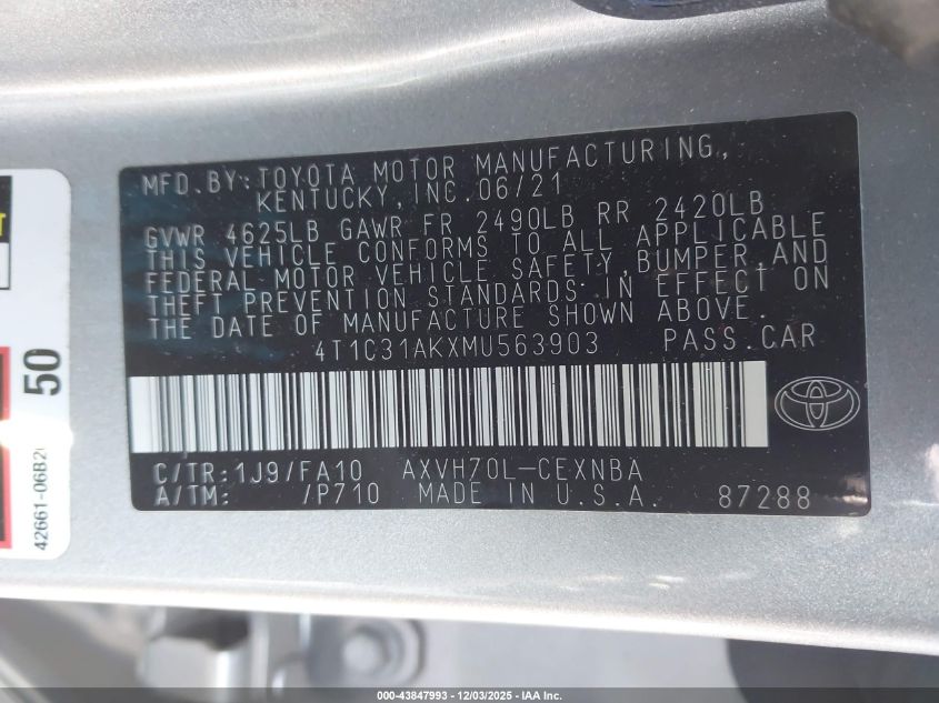 2021 TOYOTA CAMRY HYBRID 2021 року Гибрид, 2.5, Передний привод, vin - 4T1C31AKXMU563903 из США