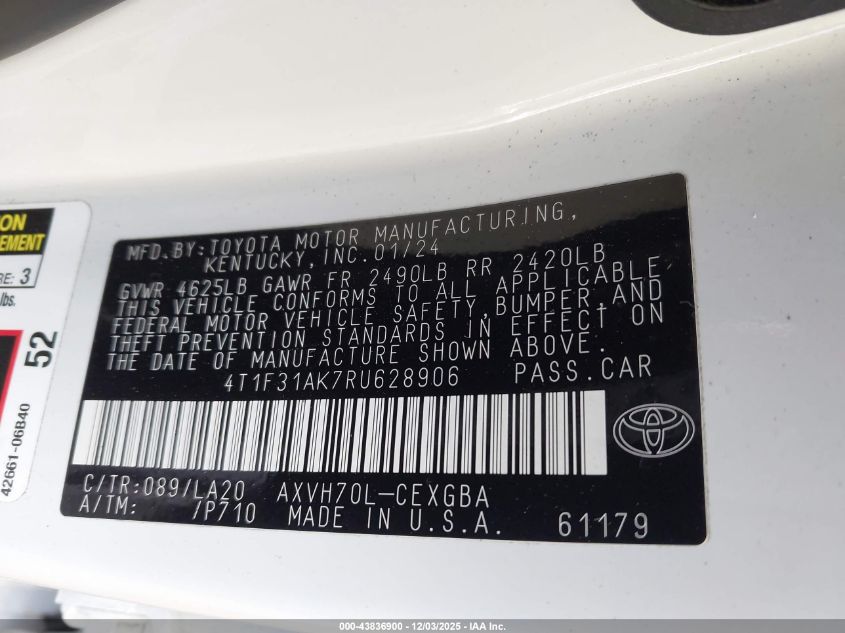 2024 TOYOTA CAMRY HYBRID 2024 року Гибрид, 2.5, Передний привод, vin - 4T1F31AK7RU628906 из США