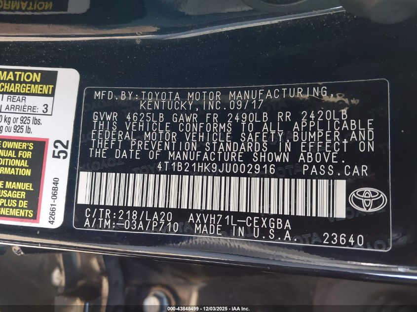 2018 TOYOTA CAMRY HYBRID 2018 року Гибрид, 2.5, Передний привод, vin - 4T1B21HK9JU002916 из США